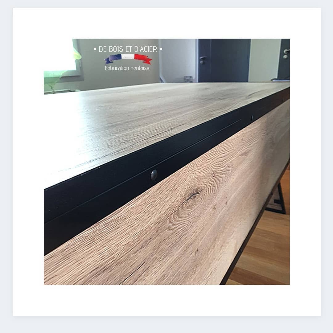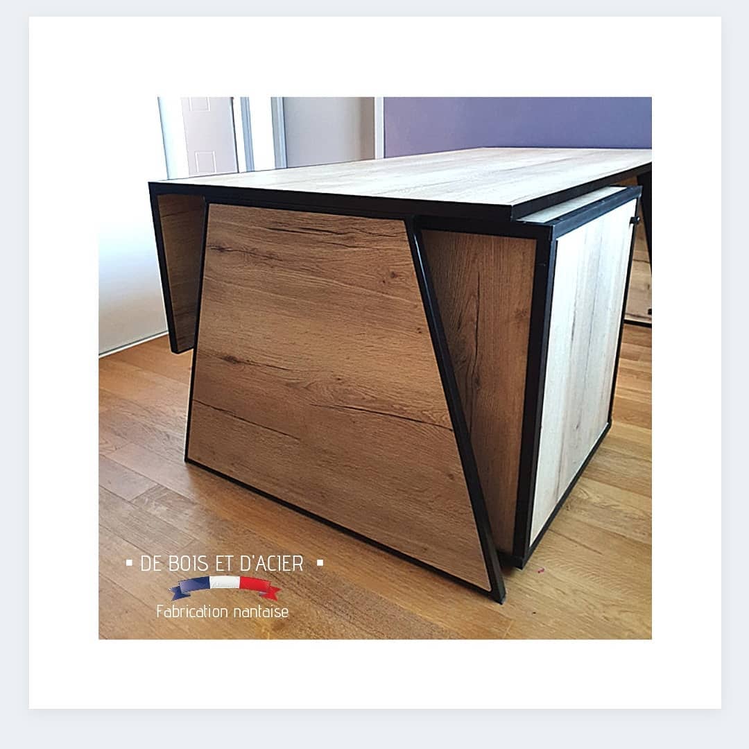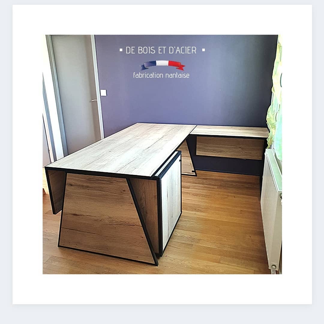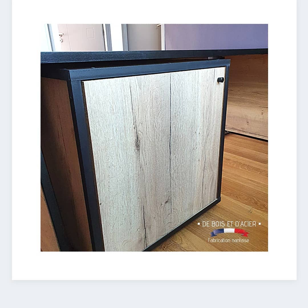 Création d’un bureau en L avec son meuble de rangement sur roulettes. Structure en acier et bois composite imitation chêne naturel pour l’habillage.