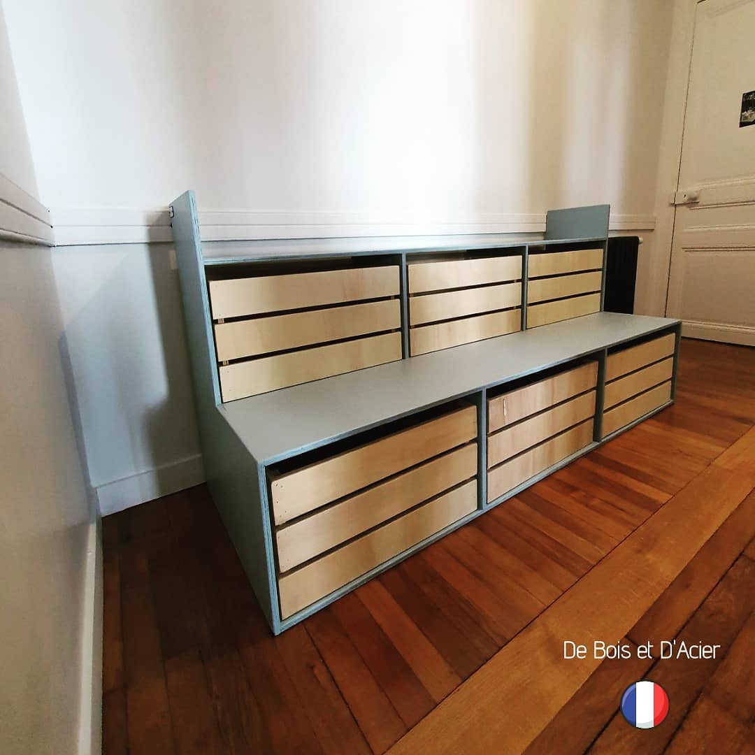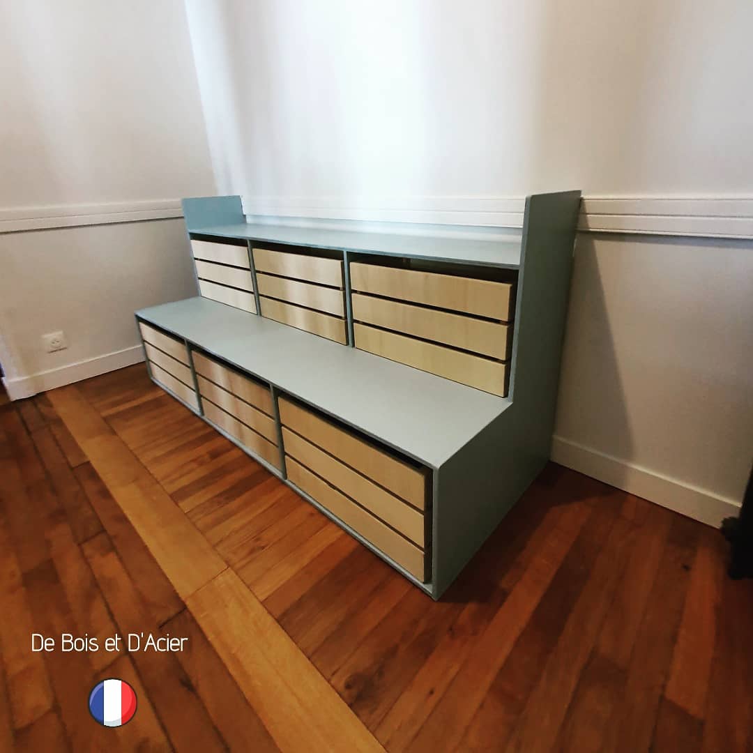 Conception d’un meuble de rangement sur 2 étages ainsi que de 6 boxes de rangements. Structure du meuble ainsi que des caisses de rangement en CP peuplier. Couleur bleu gris sur mesure.