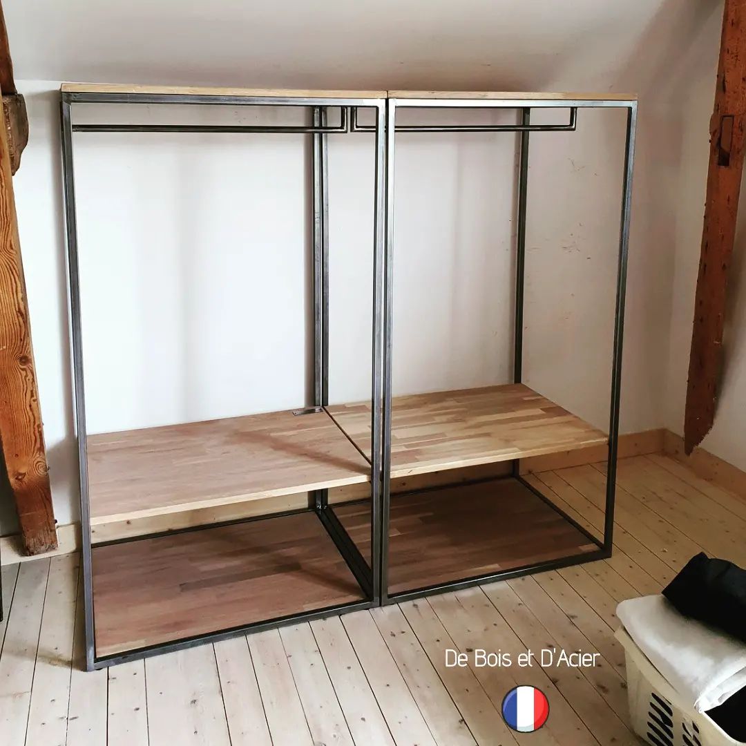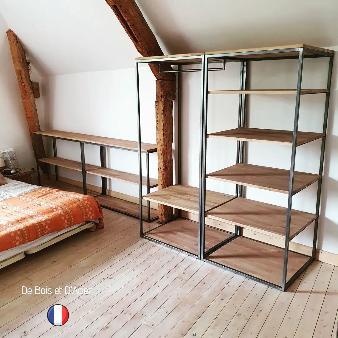 Créations sur mesure de plusieurs dressings et bibliothèques dans une chambre. Structure en acier brut vernis mat. Habillage en chêne massif lamellés collés vernis mat incolore.