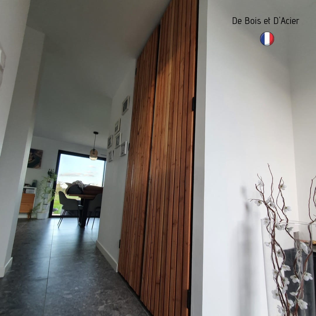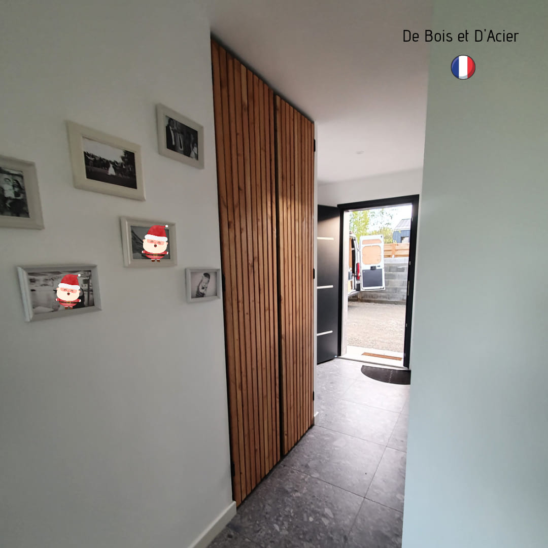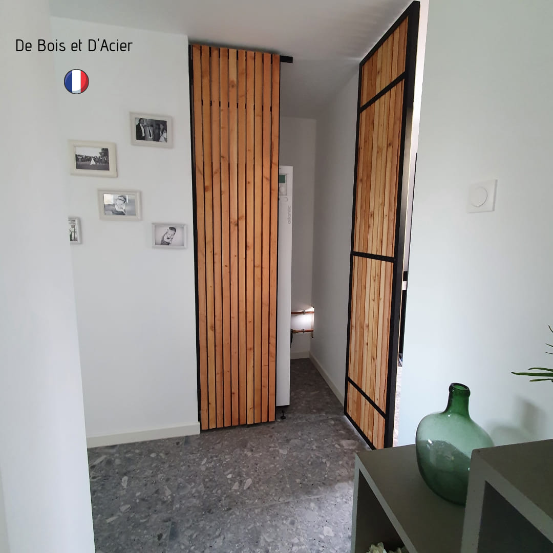 Création d’un bloc porte sur mesure pour cacher la chaudière. Structure en acier noir mat. Habillage de la porte avec des tasseaux de 45*45 mm de DOUGLAS naturel. Vernis incolore naturel.