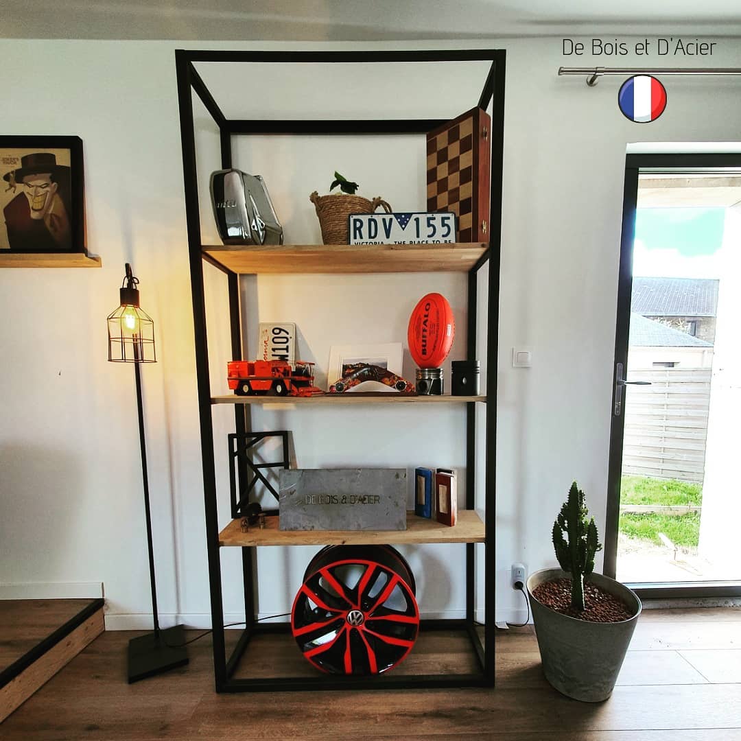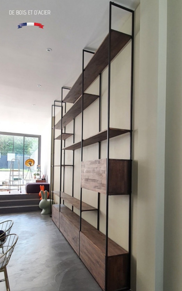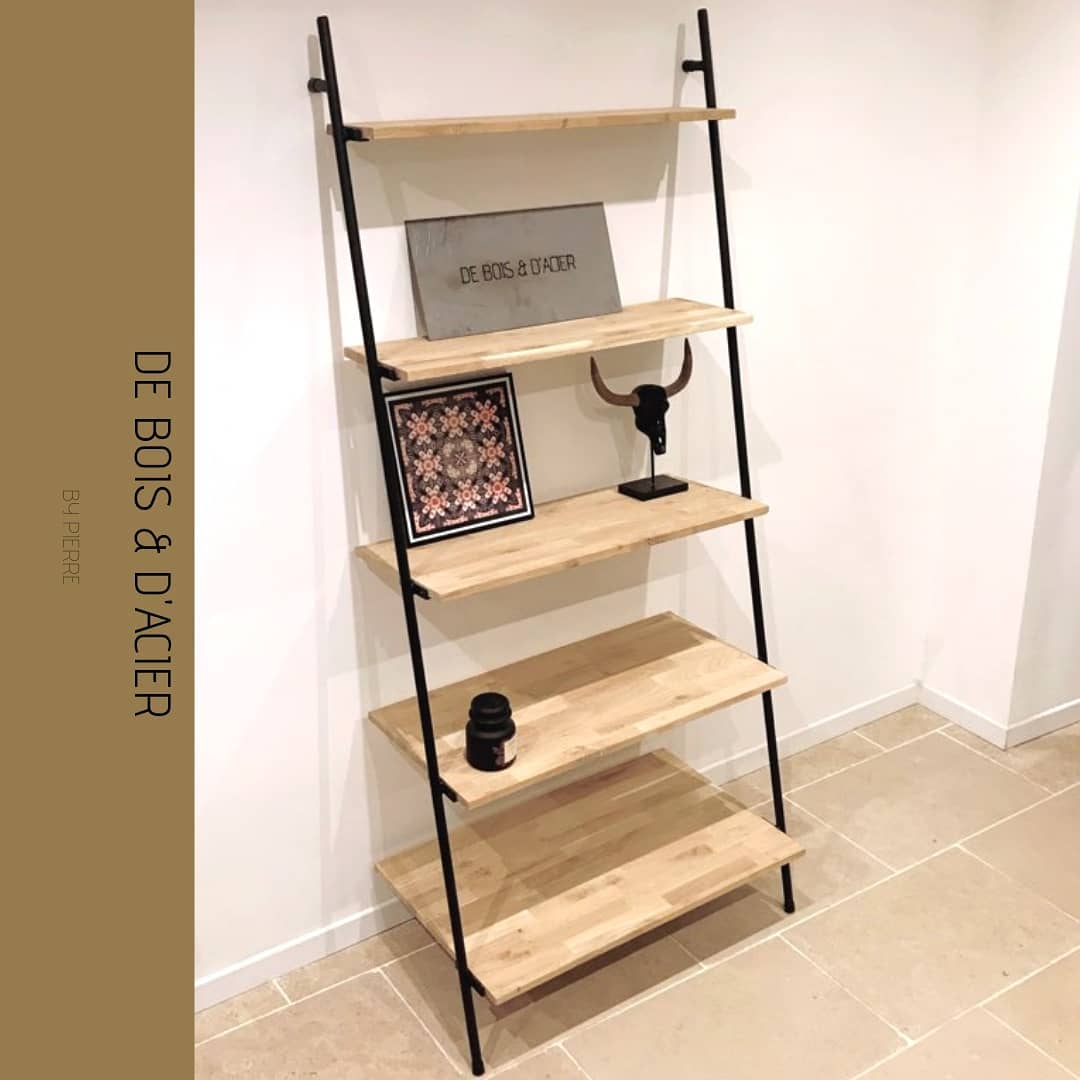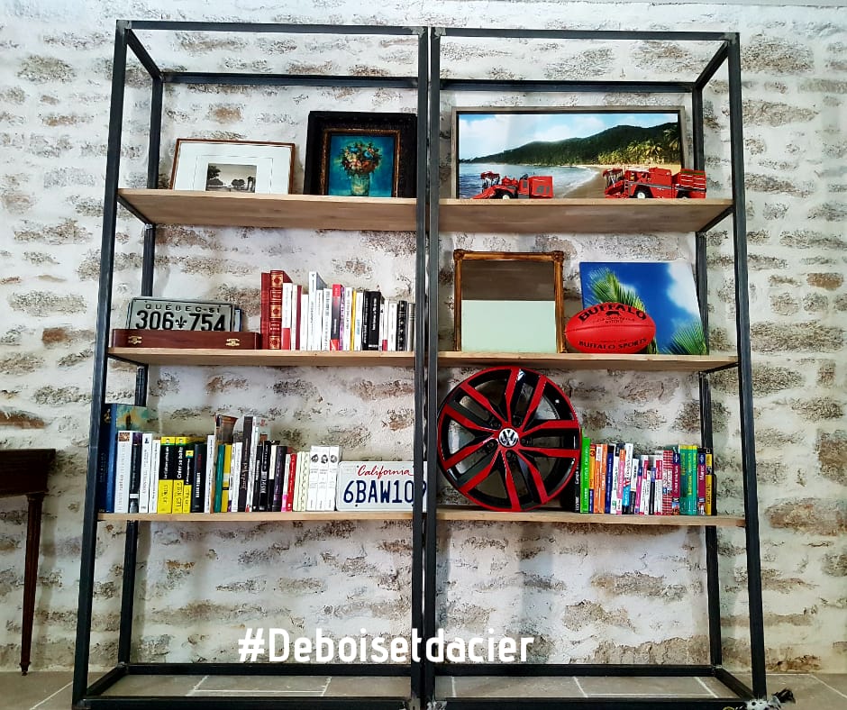 Bibliothèque structure en acier brut et plateaux en chêne massif