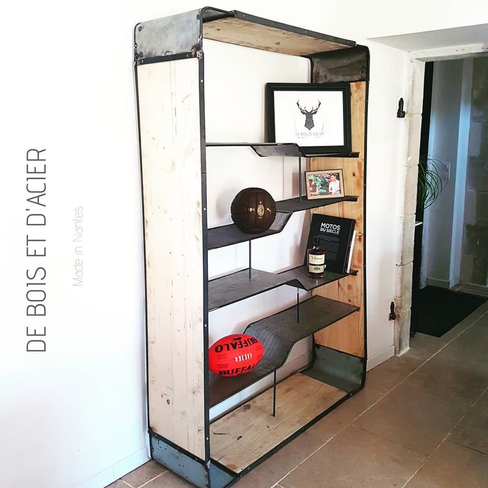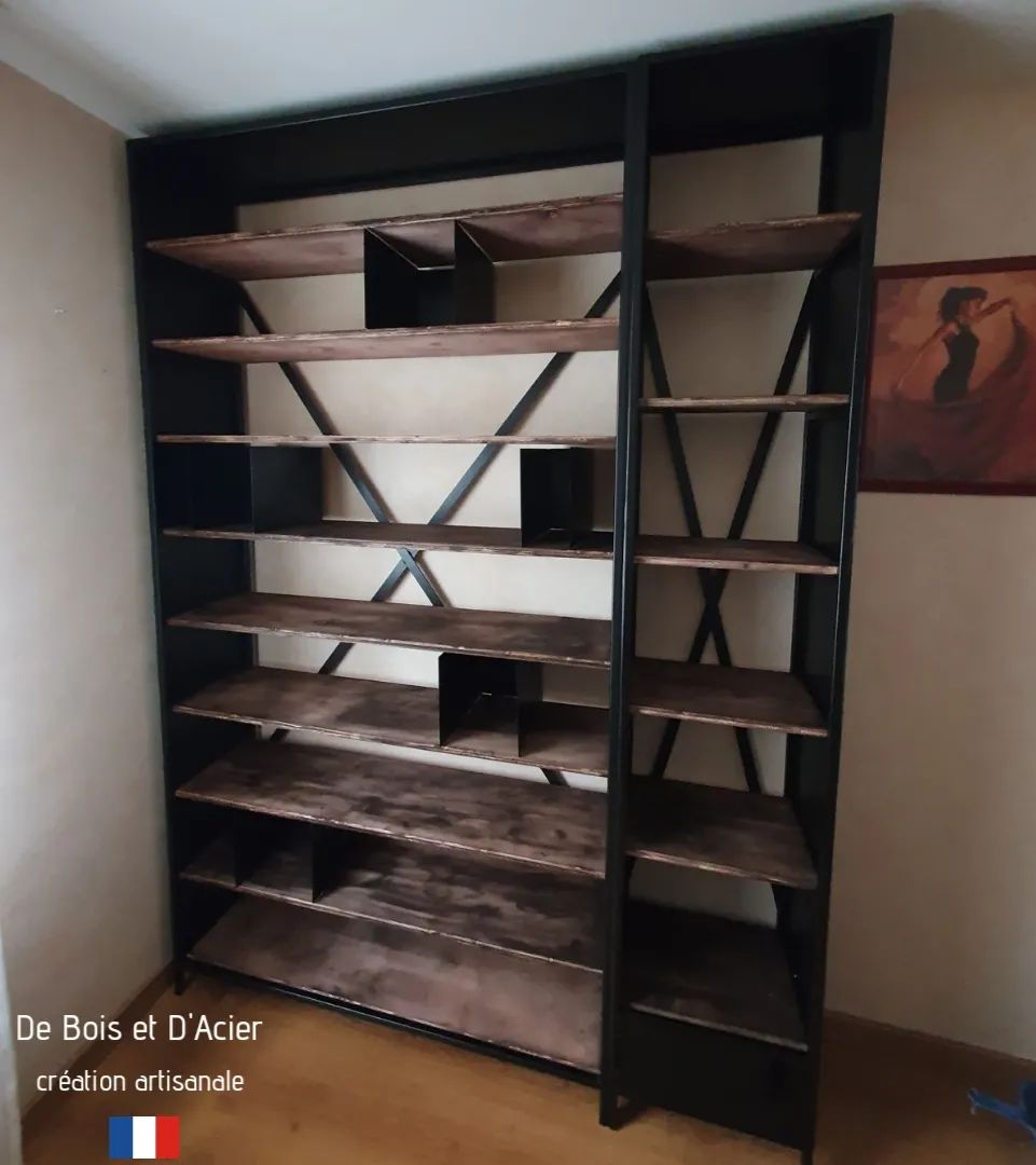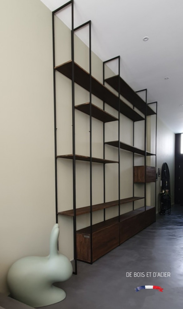 Bibliothèque structure en acier brut et plateaux en chêne massif