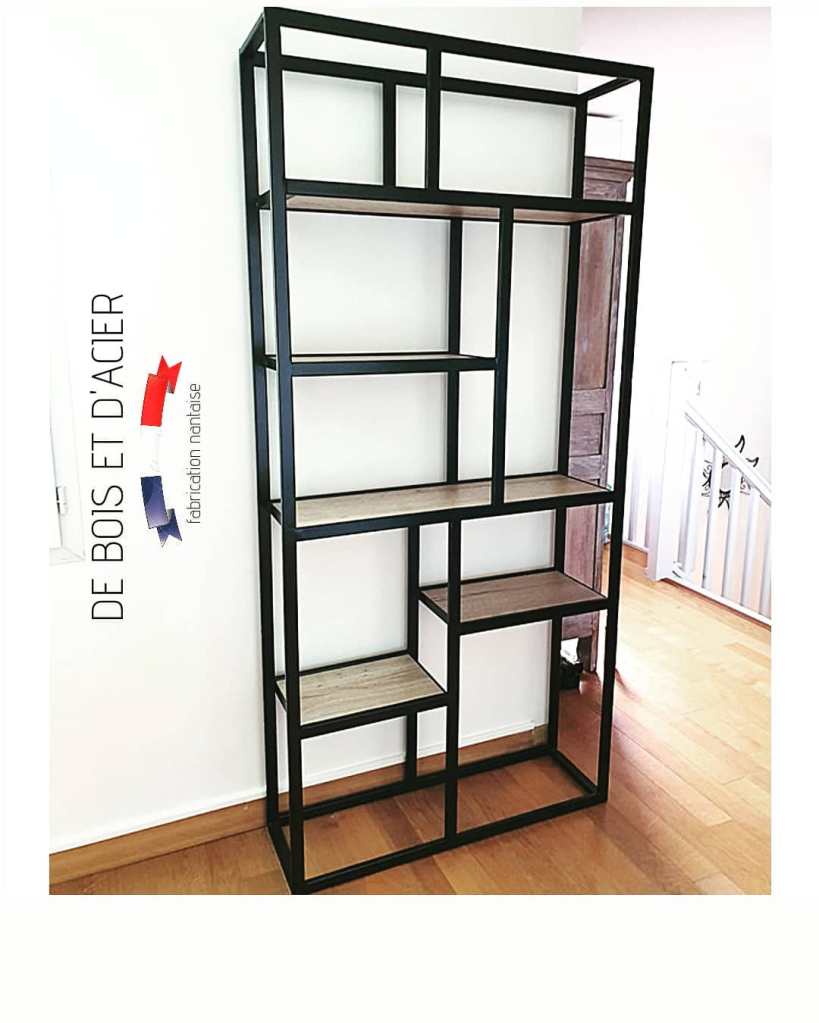 Bibliothèque en acier noir mat 2,5M par 1M. Etagères en chêne massif.
