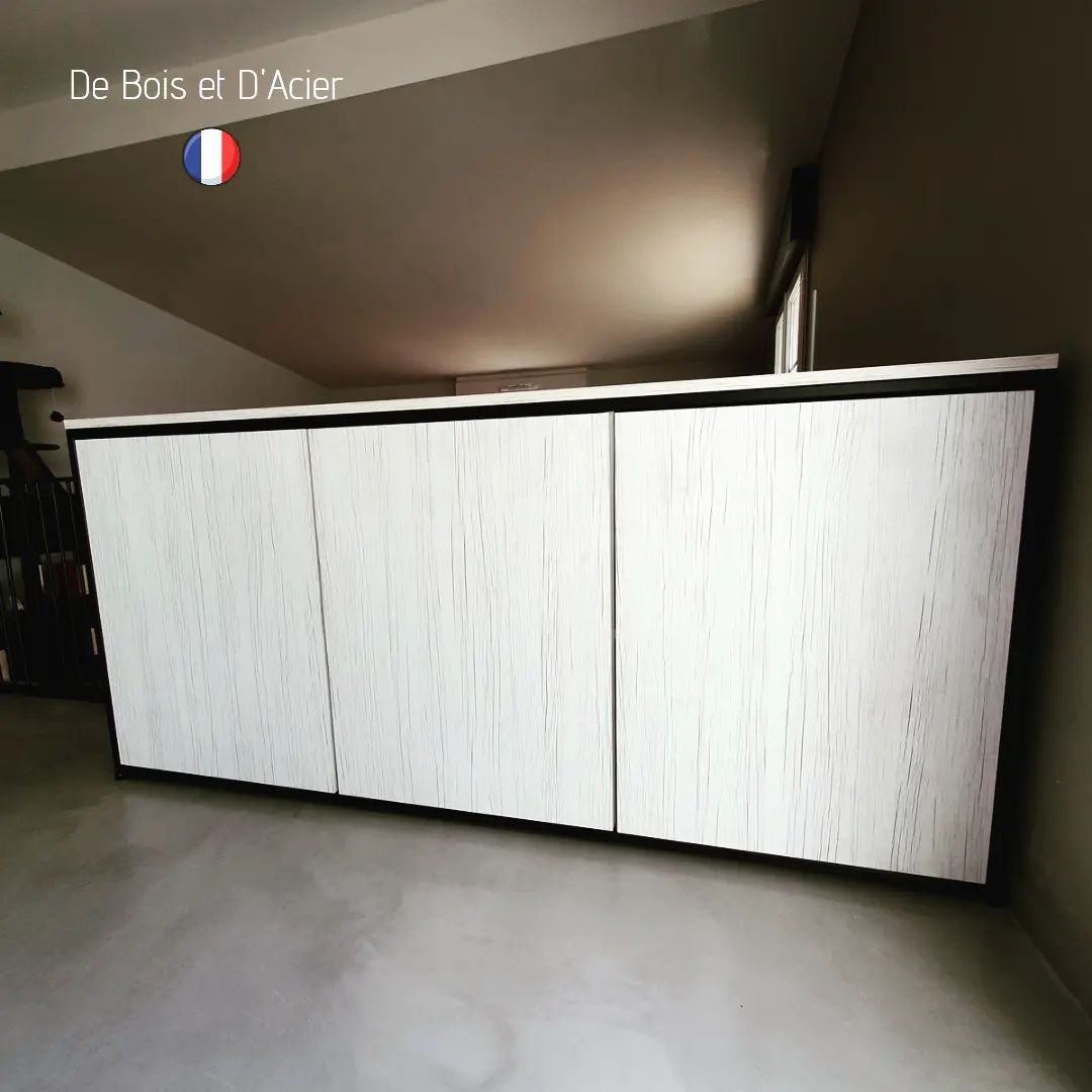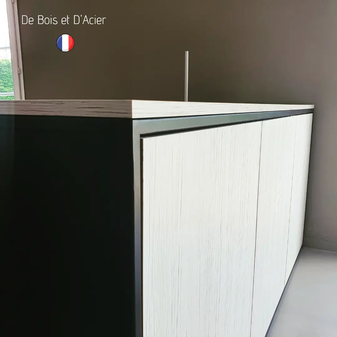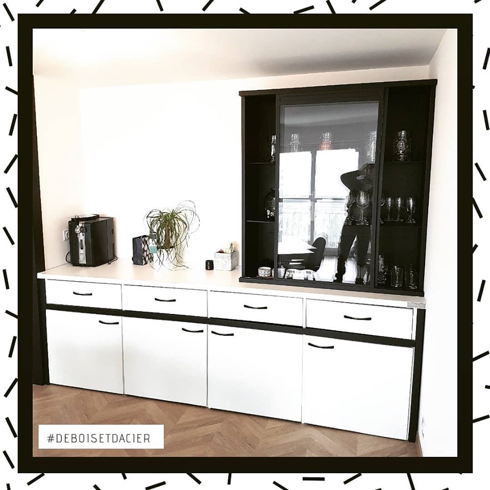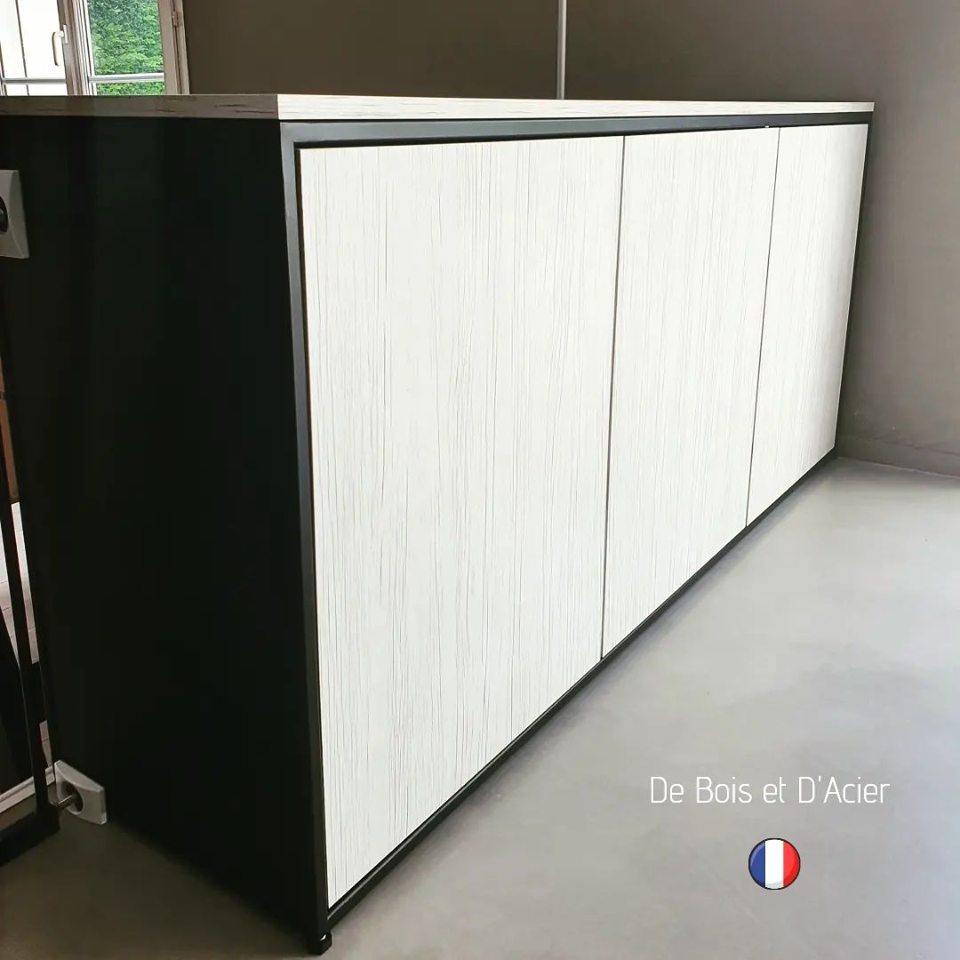 Création sur mesure de 2 buffets. Structure en acier noir mat. Habillage en mélaminé avec 2 types de couleurs différentes. Bandes de chants ABS (très résistantes). Systèmes d’ouvertures en push up (pas de poignées).