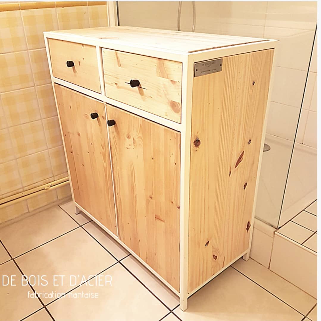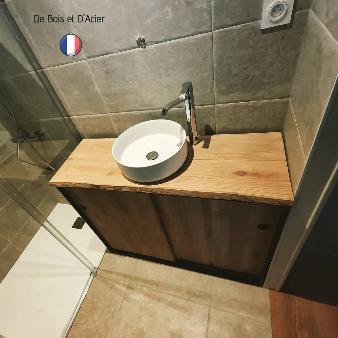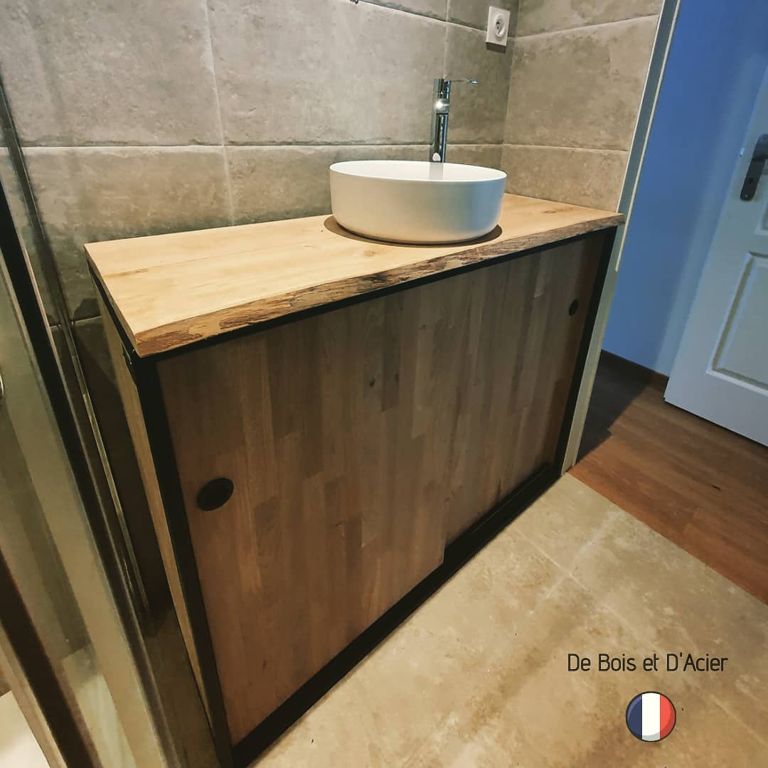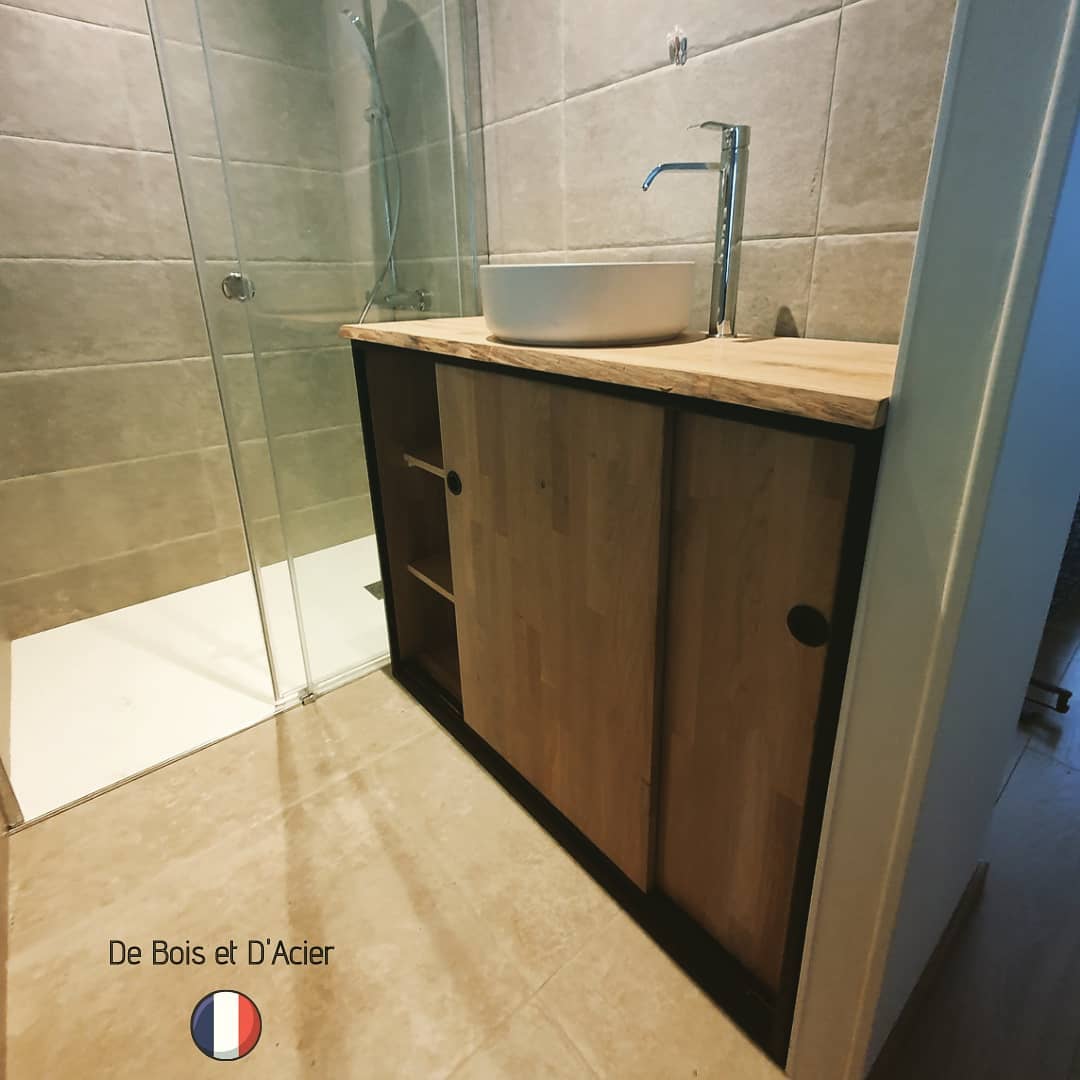 Meuble/Buffet de SdB sur mesure. Structure en acier noir mat. Plateau en chêne massif avivé. Portes coulissantes en chêne massif. Vernis rubio.