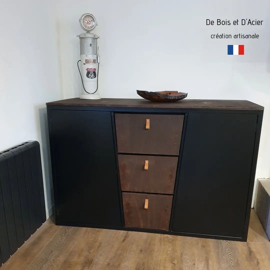 Meuble buffet de cuisine sur mesure symètrique. Portes en acier noir mat. Tiroirs X3 avec lanières de cuir. Habillage et plateau en épicéa vernis marron de chez Rubio.