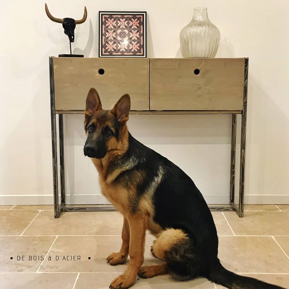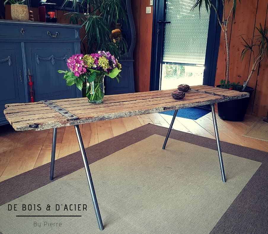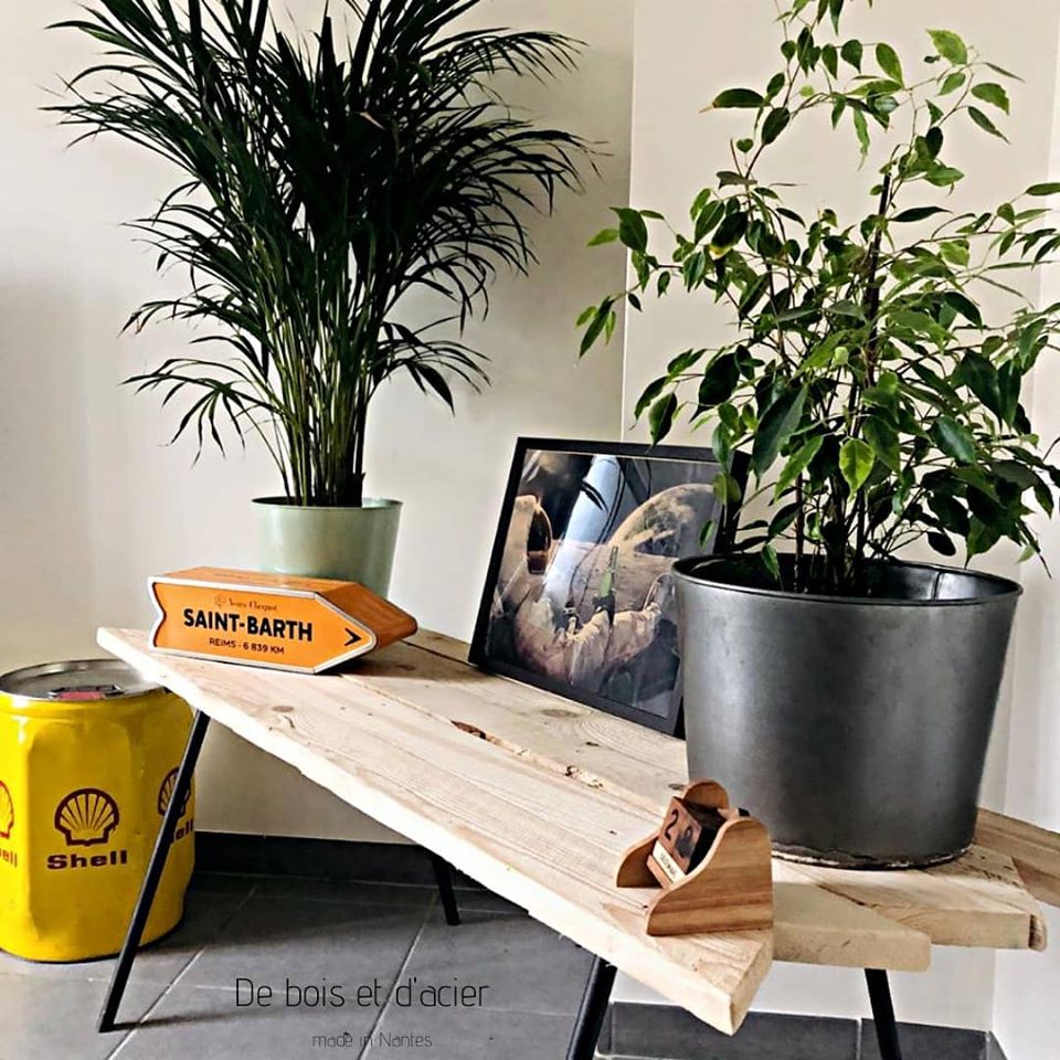 Console avec un ancien volet (2nd vie) retravaillé et structure en acier brut