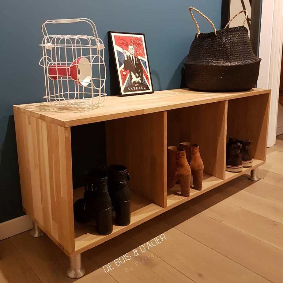 Console structure en acier brute et épicéa massif avec un système de portes.