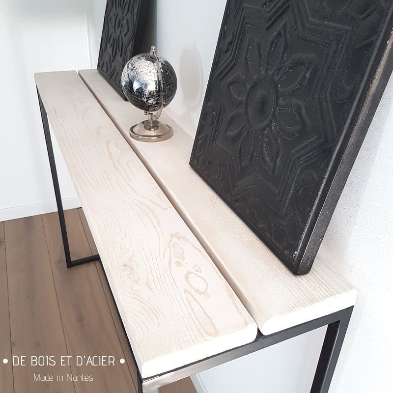 Console décorative structure en acier noir mat et plateau en épicéa blanc vieilli. (Idéal dans un couloir une chambre ou espace de vie)