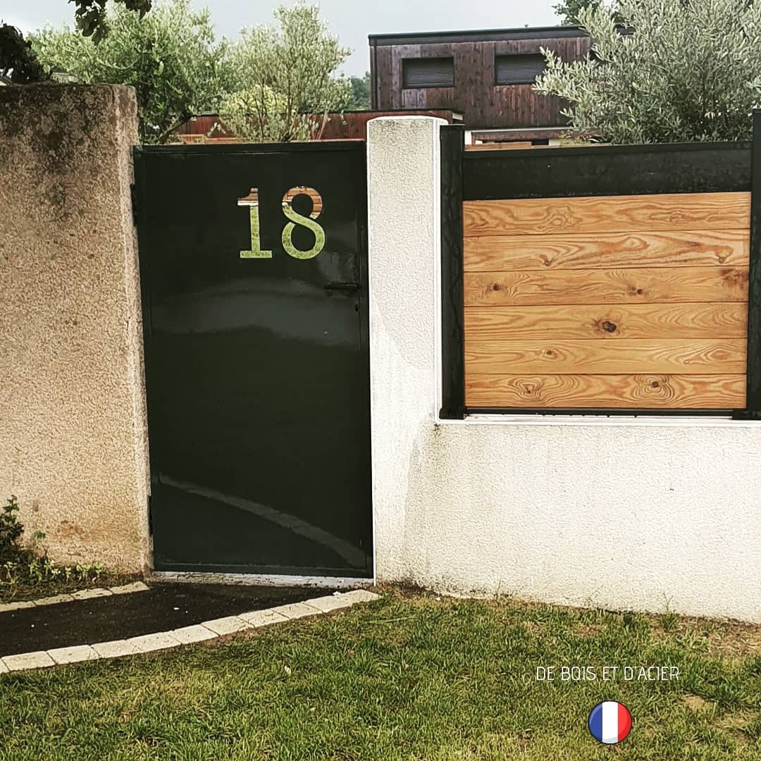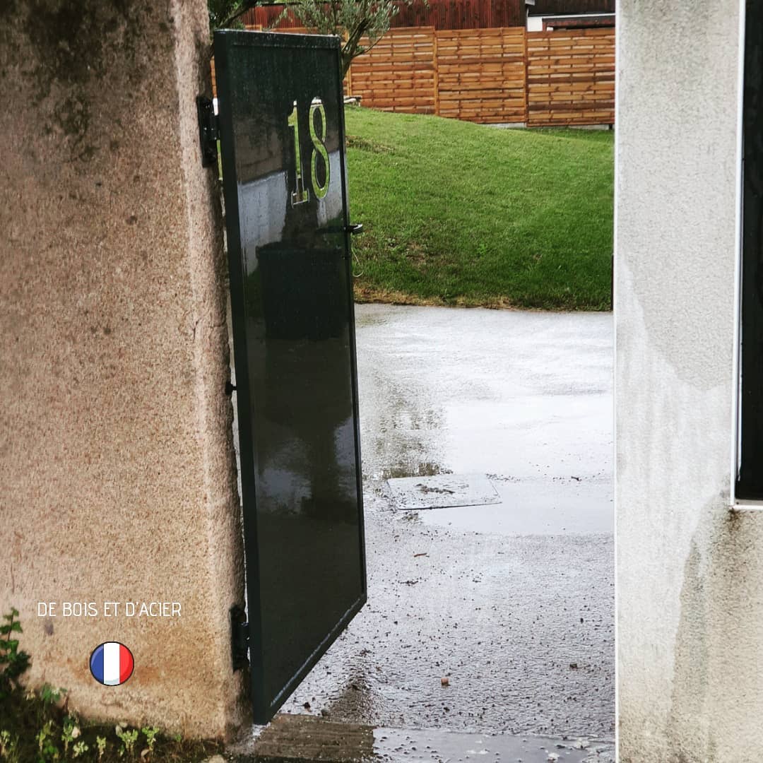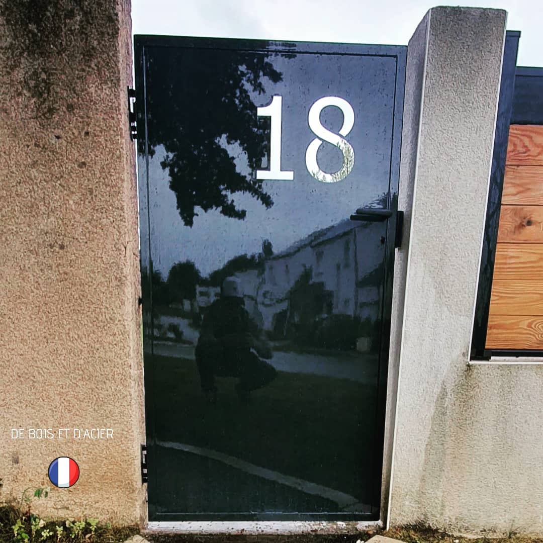 Création d’un portillon sur mesure en acier RAL 7016 avec une découpe laser du numéro de la maison le 18. Système de verrouillage à clés intérieur/extérieur.