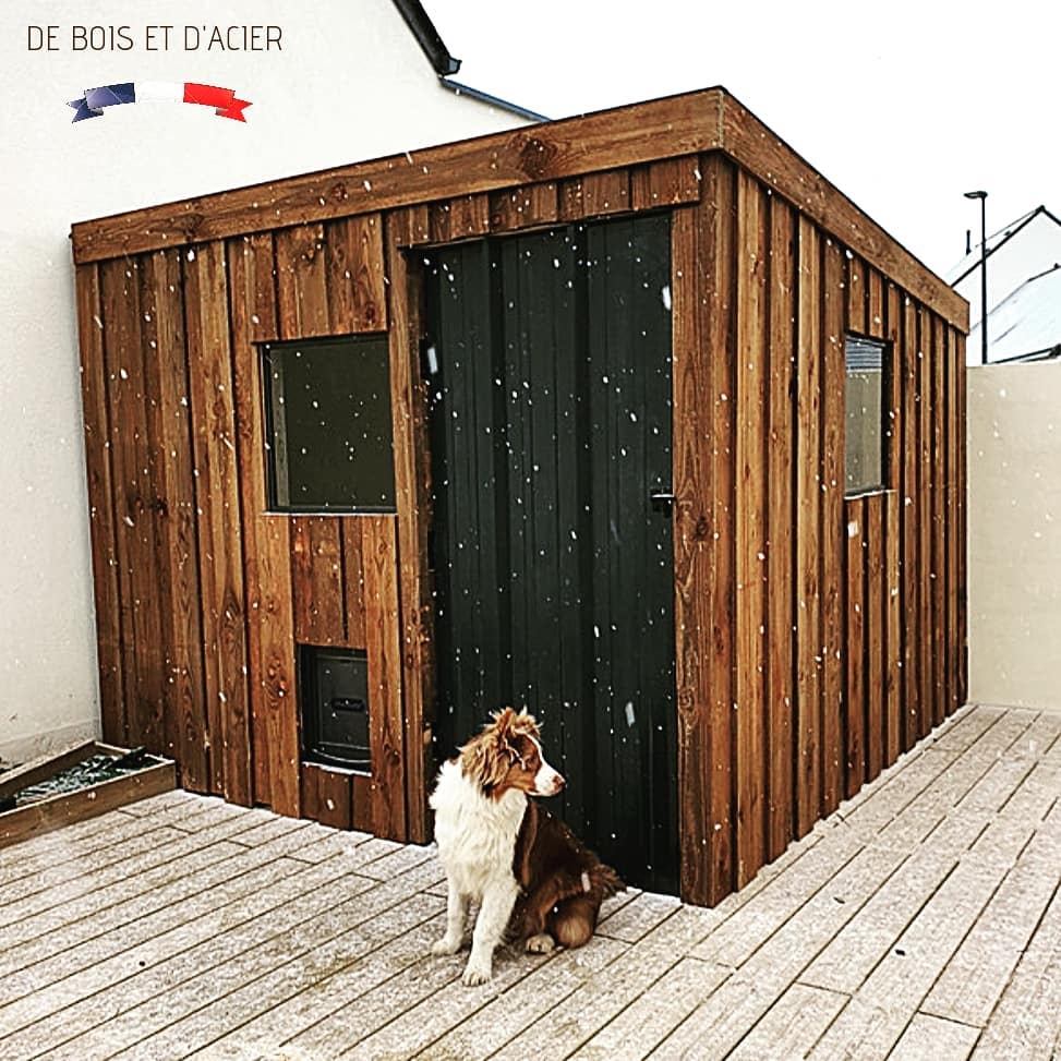 Création d’un aménagement extérieur, ici un cabanon de 8m2. Porte, fenêtres en verres feuilletés securit et chatière sur mesure. Habillage en bois autoclave 4 ( le plus résistant aux intempéries). Toit plat monopente en RAL 7016. Installation d’une trappe pour la passage autonome du chien.