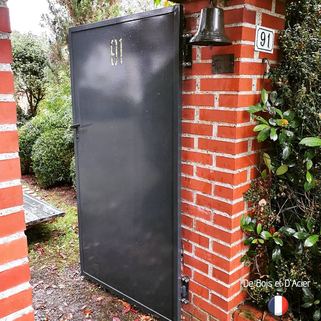 Création d’un portillon sur mesure en acier RAL 7016 avec une découpe laser du numéro de la maison le 18. Système de verrouillage à clés intérieur/extérieur.