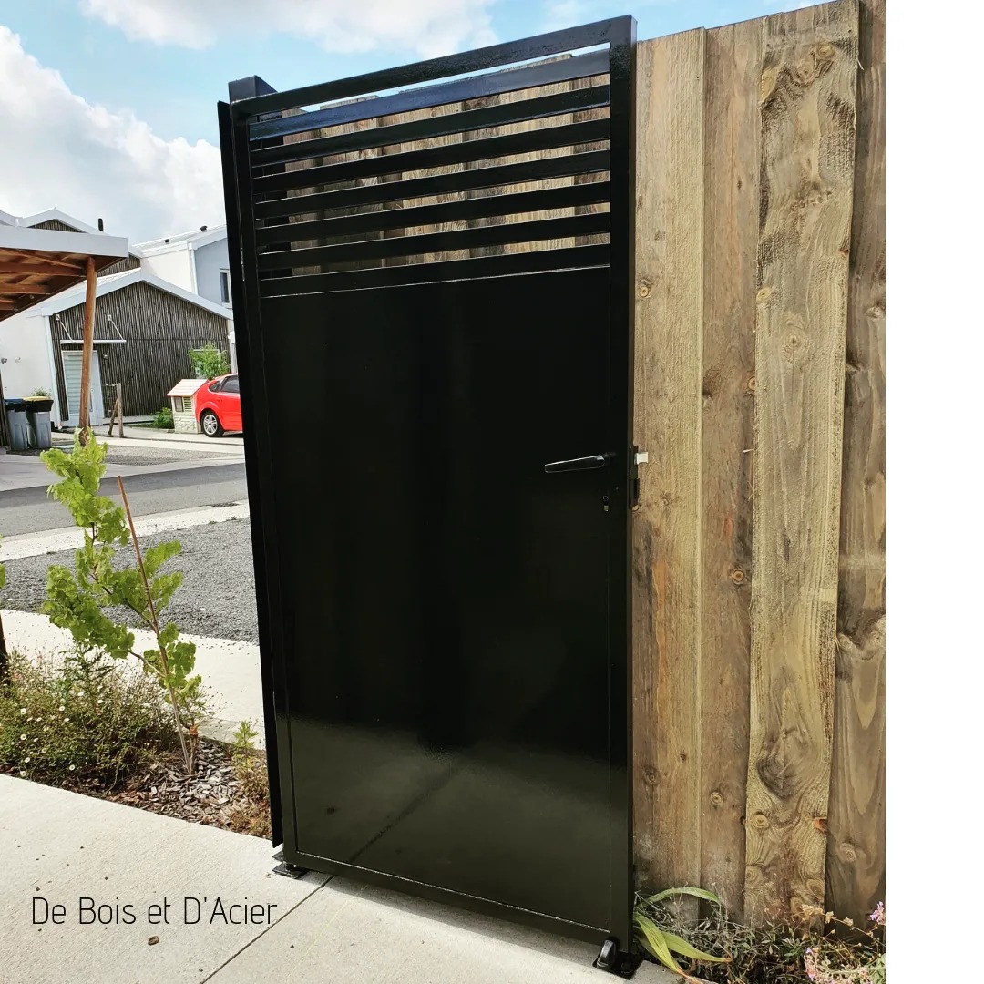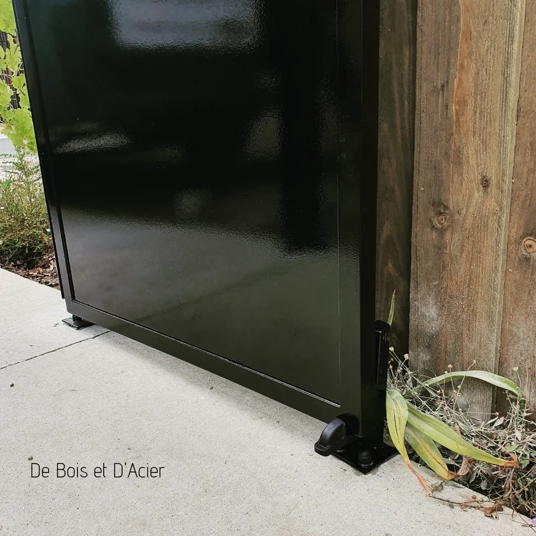 Création d’un portillon sur mesure avec ses 2 poteaux verticaux et sa butée de fin course. Structure acier RAL 9005 et vernis brillant.