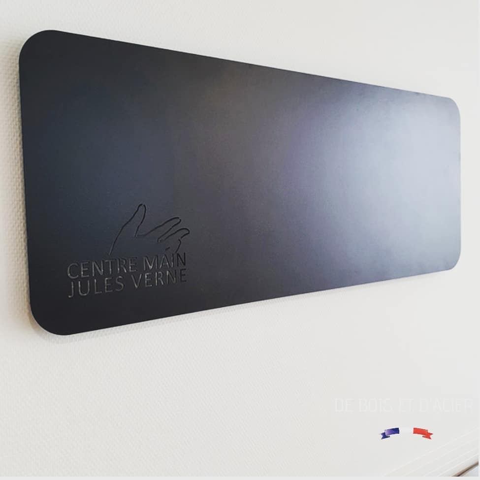 Table en INOX 100% avec découpe laser du Logo du Centre de la main. Table sur roulettes freins.
