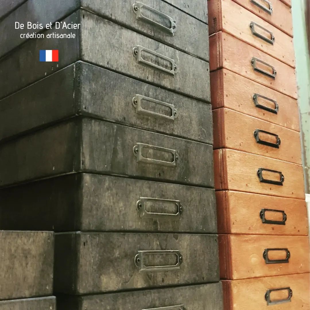 Créations de péniches de rangements pour les dossiers clients pour le magasin d’optique: « L’atelier de l’optique » à Nantes. Péniches en CP peuplier vernis (3 couleurs de chez Rubio). Portes étiquettes en fer forgés.