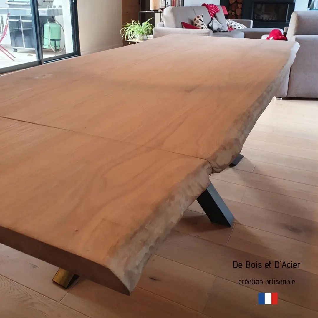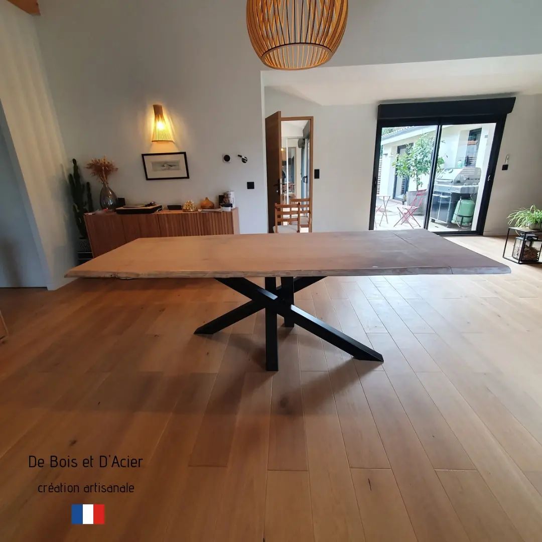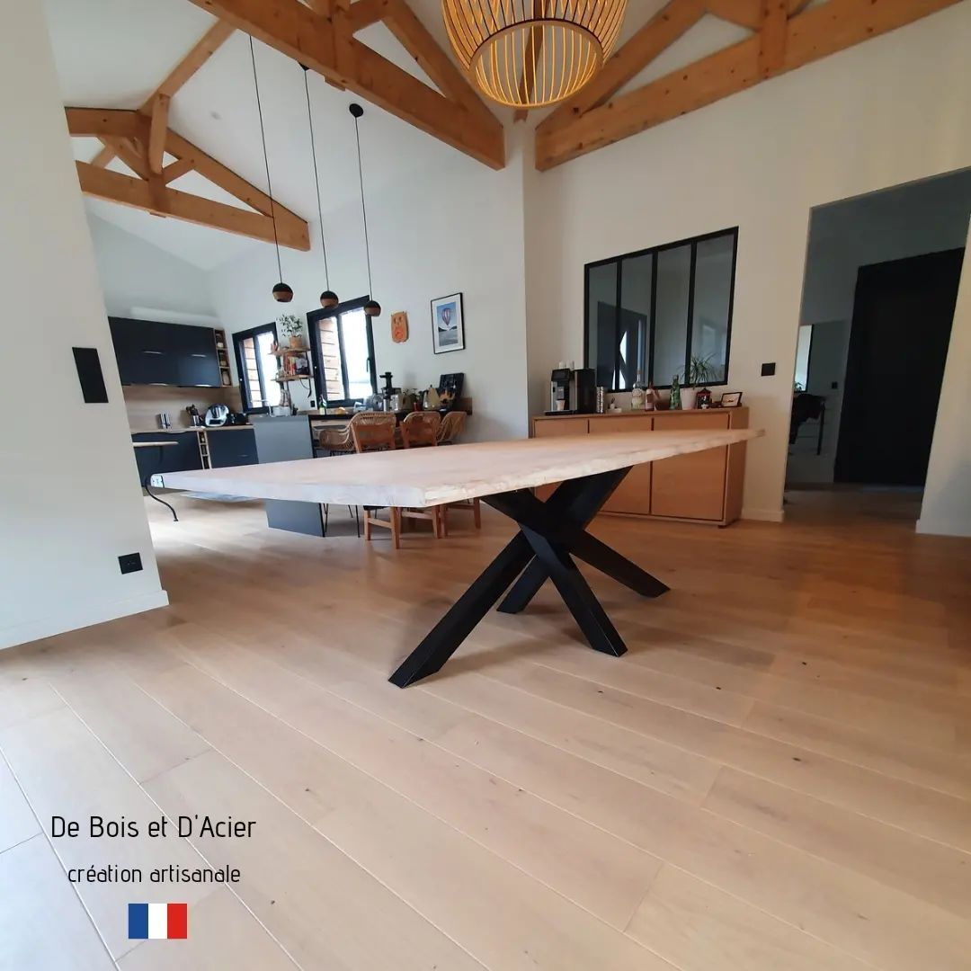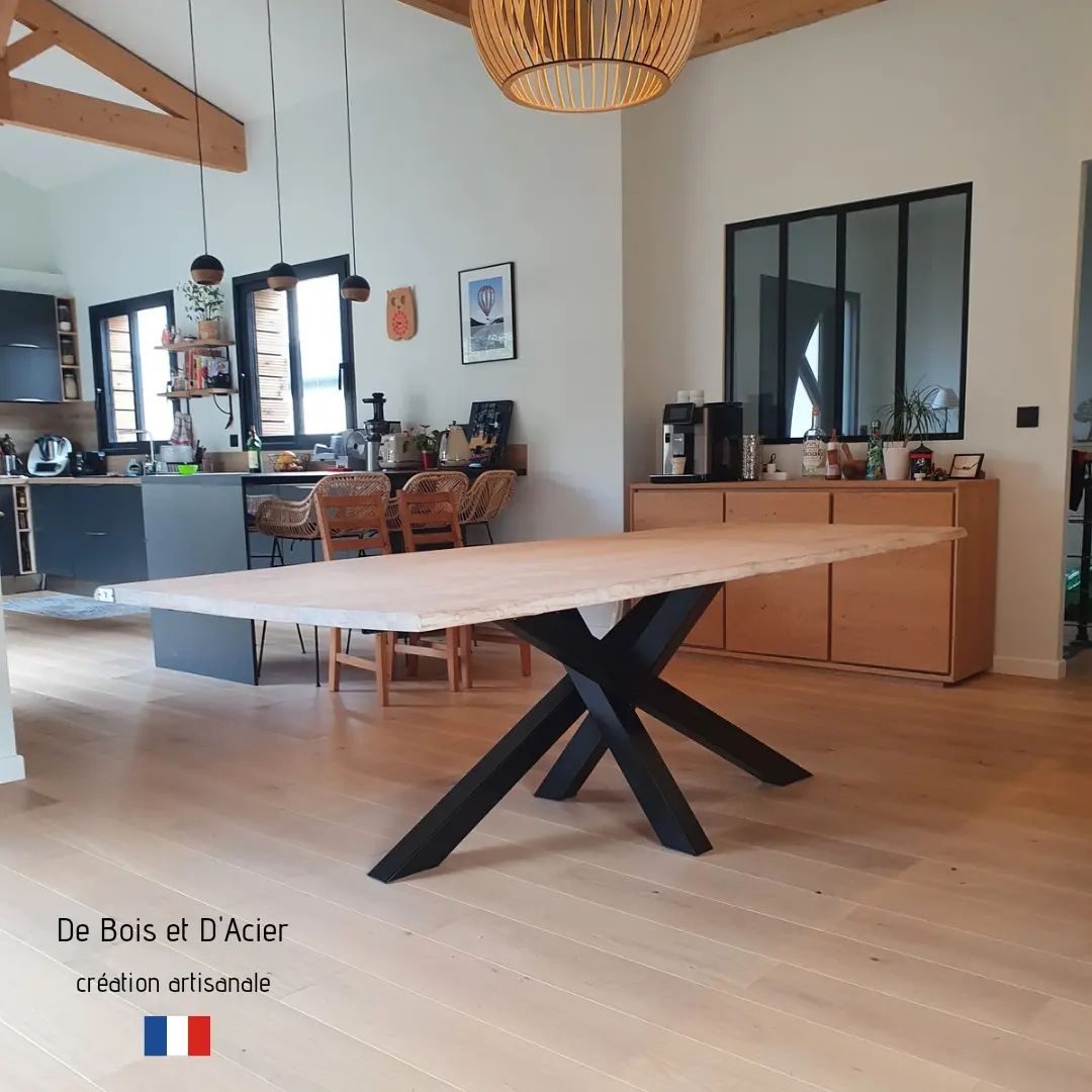 Table à manger en chêne massif avivé L: 3,60m l: 1,20m. Pieds en Croix noir mat, structure des pieds en acier.